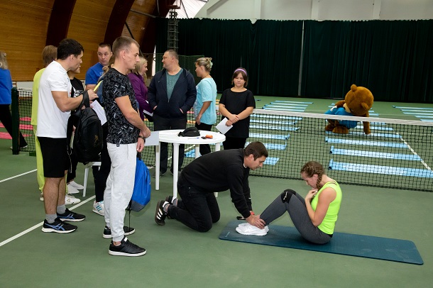 На протяжении всего Дня физкультурника в Теннис-центре работала информационная стойка регистрации в приложении «Атом-спорт», где любому желающему помогали зарегистрироваться в приложении и объясняли базовые принципы работы в нём.